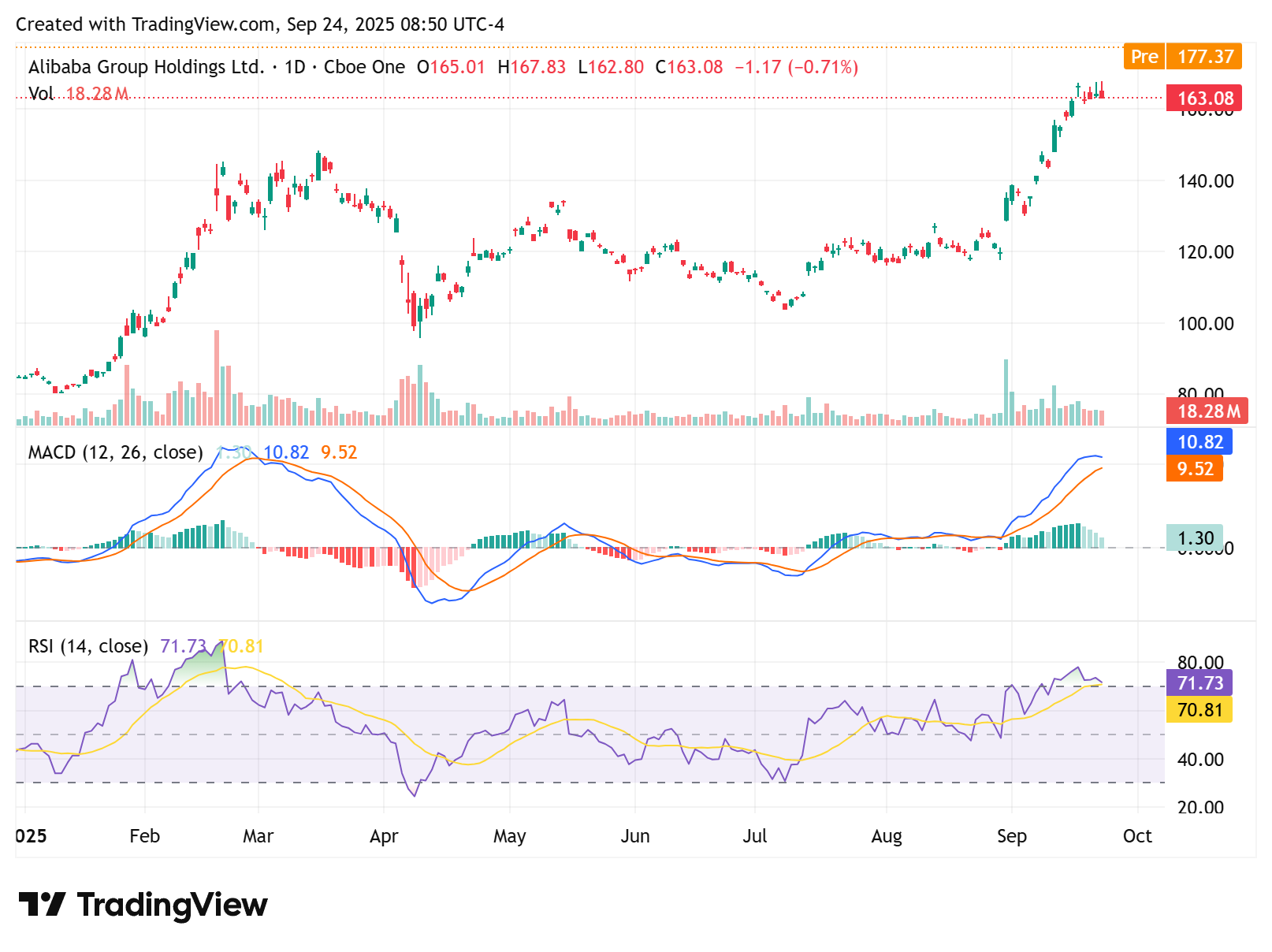 The stock reaction was immediate. Hong Kong-listed shares hit a 4-year high, while U.S.-listed shares surged nearly 10% premarket to ~$178, decisively clearing the long-standing 167–170 resistance zone. Buyers are front-running the next wave higher, pushing the stock into extension territory without consolidation.